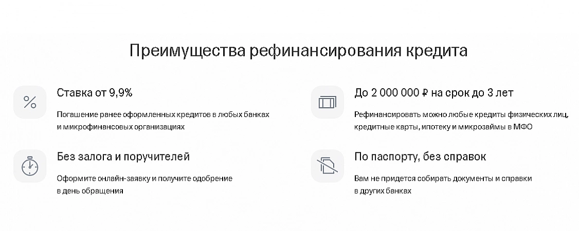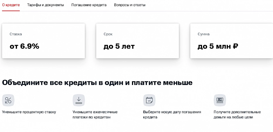 C'est la seule banque qui vous permet d'inclure dans le programme de refinancement non seulement les prêts à la consommation et les hypothèques, mais également les prêts reçus des organismes de microfinance.