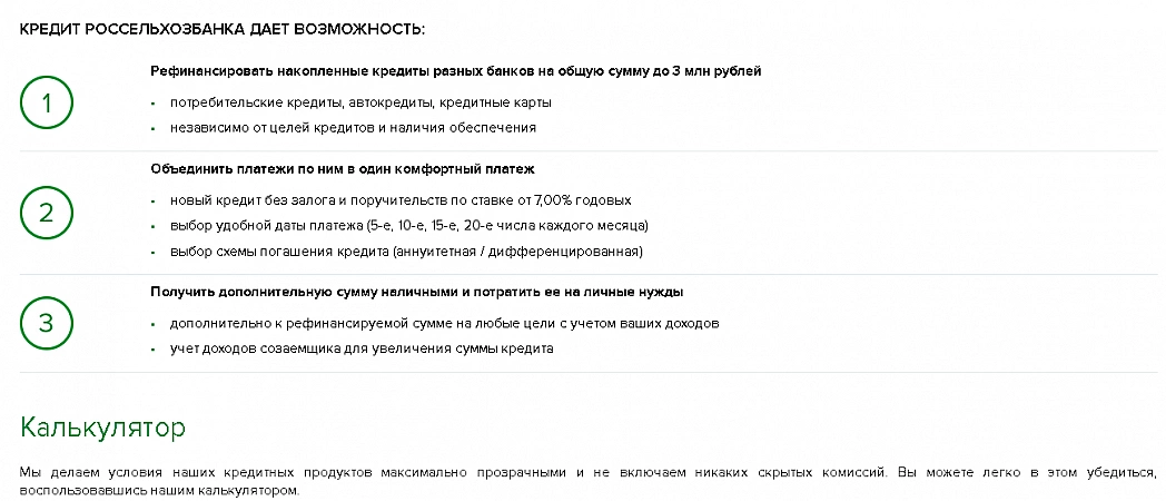 Rosselkhozbank vous permet de prendre de 30 000 à 3 millions de roubles.Mais seuls les salariés du secteur public ayant souscrit une assurance personnelle et souscrit en ligne peuvent compter sur le taux minimum de 7 %. L'argent doit être restitué dans les 5 ans. La banque est prête à offrir les meilleures conditions aux employés du secteur public et aux clients salariés. Il est nécessaire de restituer les fonds dans les 7 ans pour les clients « fiables », salariés et employés de l'État. Malheureusement, seuls trois prêts peuvent être refinancés, cette option ne convient donc pas aux clients littéralement envahis par les dettes. Mais Rosselkhozbank vous permet de choisir l'un des quatre jours de paiement par mois. Une nuance importante est que vous pouvez augmenter le montant du prêt pour le refinancement au détriment des dettes des co-emprunteurs. Il est désagréable que les prêts sélectionnés pour le refinancement ne soient pas restructurés ou prolongés plus tôt.