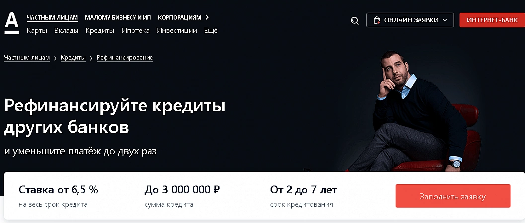 Alfa-Bank offre des conditions de refinancement assez favorables et pratiques. L'institution vous permet de recevoir un montant de 50 000 à 3 millions de roubles pendant 7 ans maximum. Vous pouvez refinancer jusqu'à cinq prêts ou cartes de crédit. La banque vous permet de recevoir une partie des fonds en espèces pour vos propres besoins, et pas seulement pour clôturer le refinancement. Je suis heureux qu'Alfa-Bank n'oblige pas les clients à souscrire une assurance - le taux annuel n'en dépend pas. Le taux d'intérêt minimum est de 6,5%, le maximum est de 13,99%, il est déterminé individuellement en fonction d'un certain nombre de paramètres. Le montant maximum du prêt jusqu'à 3 000 000 roubles n'est disponible que pour les clients salariés, tous les autres peuvent compter sur 1 500 000 roubles et jusqu'à 5 ans.