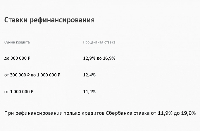 Sberbank est une banque fiable et éprouvée. Mais en échange de la confiance en son honnêteté, il n'offre pas le programme de refinancement le plus rentable. Le pourcentage minimum commence à partir de 11,9%, sous réserve de l'enregistrement du montant à partir de 1 000 000 de roubles. Si vous empruntez moins de 300 000 roubles, le taux peut aller jusqu'à 16,9 %. La période maximale pendant laquelle les paiements peuvent être étirés est de 5 ans. En plus de couvrir les prêts, vous pouvez recevoir un montant pour toute autre dépense. Il est pratique que les clients n'aient pas à se rendre au bureau, tout peut être fait indépendamment via Sberbank-Online. Prendre une décision dans ce cas peut prendre de 2 minutes à 2 jours.