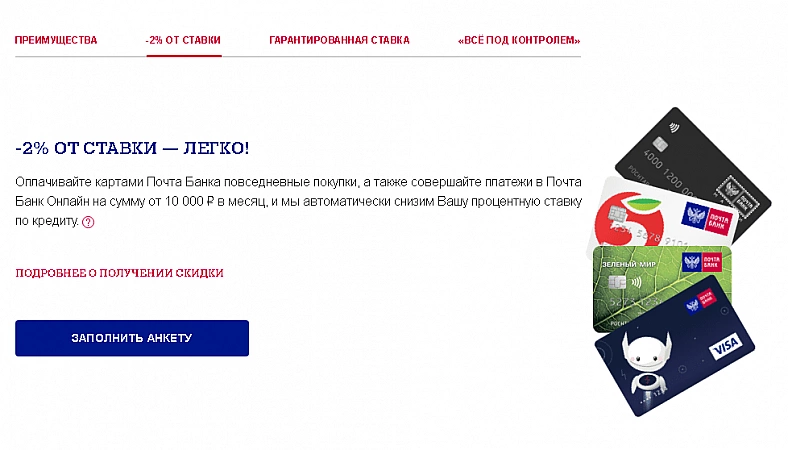 Post Bank propose un refinancement des prêts à des conditions tout à fait acceptables à un taux de 5,9 à 11,9%. Cela peut inclure tout prêt à la consommation ou auto. Mais gardez à l'esprit que Post Bank ne refinance pas les prêts émis par les institutions financières du groupe VTB. L'offre est particulièrement avantageuse pour les titulaires d'une carte de débit bancaire. En payant ses achats à partir de 10 000 roubles par mois, vous pouvez réduire le taux d'intérêt jusqu'à 2 %. De plus, l'action "Zero Doubts" est proposée. En le connectant, vous pouvez obtenir un délai de grâce de 3 mois sans facturer d'intérêts et, à l'avenir, effectuer des paiements de seulement 0,5% du montant du prêt avec une augmentation de la période de remboursement de 4 mois. Mais pour cela, un contrat d'assurance doit être établi.