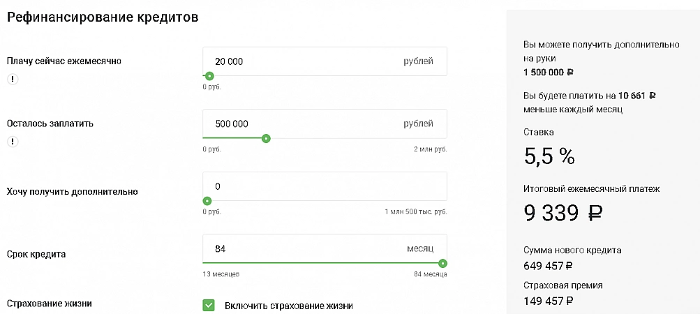 Gazprombank est prête à inclure dans l'offre de 100 000 à 5 millions de roubles pour le refinancement des prêts. Délai de remboursement - de 13 mois à 7 ans. Le taux d'intérêt commence à partir de 5,5 %. Cependant, ce taux est fixé pour les personnes qui assurent nécessairement le prêt. Sinon, vous devrez vous contenter du taux de 13,9 %. Gazprombank possède le meilleur calculateur de prêt. Littéralement, tout peut être calculé en l'utilisant - du montant requis au montant du trop-perçu sur un prêt auprès d'une banque. De plus, il vous permet de connaître le revenu minimum requis ou de calculer la limite possible en fonction des besoins et des revenus du client. C'est très pratique et aide à comprendre à quoi s'attendre de la banque dans la décision finale. Fait intéressant, la banque est prête à accepter une garantie pour les personnes morales.Dans le même temps, le montant de la limite de crédit peut être augmenté si une personne morale offre un montant de garantie supérieur à sa limite supérieure.