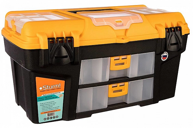 Pour ceux qui aiment que tout reste à sa place, nous pouvons recommander le modèle Sturm TBPROF21. Il offre les meilleures possibilités d'organisation de l'espace intérieur, de placement rationnel des grands et petits outils. L'espace intérieur est divisé en compartiments réglables, sur le couvercle et sur les côtés du tiroir se trouvent plusieurs organisateurs pratiques pour les petits objets.Une caractéristique intéressante est que le couvercle s'ouvre dans les deux sens en raison de la conception spéciale des serrures. La boîte est idéale pour ranger les outils à la maison ou les transporter à des fins professionnelles. Pour se protéger des enfants ou effectuer des travaux de terrain, la conception prévoit la possibilité d'installer un cadenas. Dans les critiques, les utilisateurs louent souvent cette boîte pour sa fiabilité, son organisation réfléchie de l'espace, son plastique durable et sa fabrication de haute qualité. Selon eux, c'est l'un des meilleurs modèles en termes de facilité de placement de l'instrument. La box est aussi bien adaptée pour le travail, la maison, la voiture. Beaucoup de gens attribuent le manque d'odeur du plastique aux avantages. La seule chose qu'ils aimeraient conseiller au fabricant est de fabriquer des loquets en métal plutôt qu'en plastique pour une plus grande fiabilité.