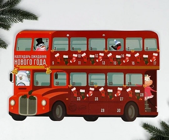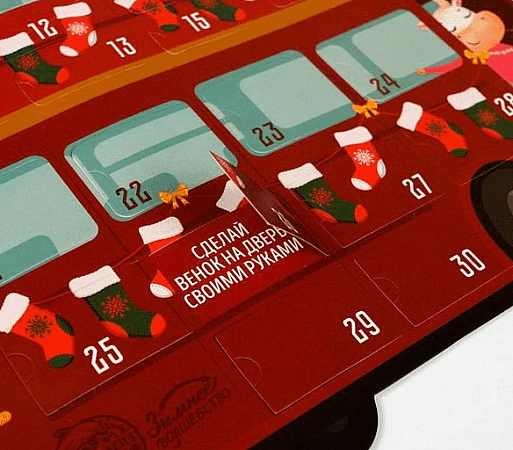 Un calendrier pour enfants aux couleurs vives sous la forme d'un bus rouge convient aux enfants et aux adultes de 4 à 5 ans pour jouer ensemble et aux enfants plus âgés de 6 à 7 ans pour accomplir des tâches par eux-mêmes. Il est conçu pour un mois, en plus d'un passe-temps passionnant, l'enfant apprend à naviguer dans le temps, commence à comprendre clairement combien de temps dure un mois et combien de jours il reste avant le Nouvel An. Dans chaque fenêtre, les utilisateurs attendent des tâches intéressantes. Par exemple, éplucher une mandarine en 10 secondes, découper des flocons de neige en papier, décorer des fenêtres avec des guirlandes. La plupart des tâches sont intéressantes, les adultes participent à leur réalisation avec plaisir. Moins - certains parents aimeraient que le bus soit volumineux.