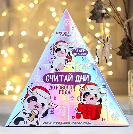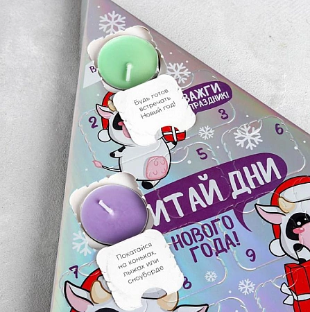 Cet ensemble sera intéressant pour les enfants à partir de 7 ans. Il compte à rebours deux semaines jusqu'au Nouvel An. Chacune des 14 boîtes contient une tâche et une bougie au parfum floral agréable. Lorsque toutes les cellules sont ouvertes et que les vacances arrivent, les bougies peuvent être allumées. Ce calendrier de l'avent sera intéressant même pour les adolescents. Dans le cas de petits enfants, les tâches et les bougies ne peuvent être allumées qu'en présence d'adultes. Le calendrier lui-même est assez joli, réalisé sous la forme d'un triangle ressemblant à un sapin de Noël.