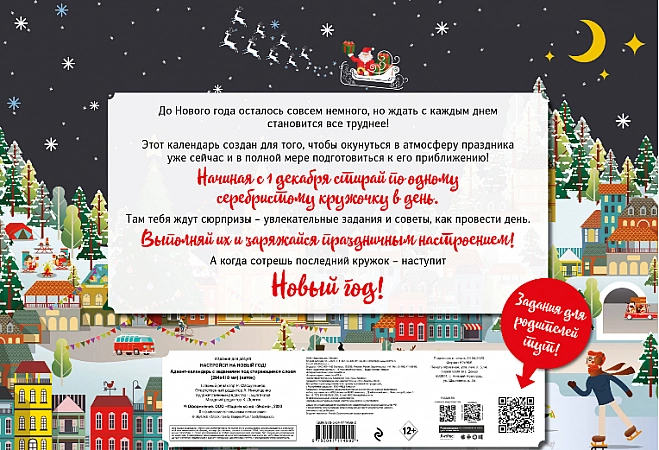 L'un des calendriers de l'avent les plus simples, les moins chers mais les plus intéressants. Il a tout ce dont vous avez besoin pour créer une ambiance festive - des intrigues et des tâches intéressantes qui réuniront toute la famille. Parmi eux, il y a des missions telles que préparer une table de fête avec Olivier et des mandarines, regarder votre film préféré du Nouvel An et aller skier. Les parents peuvent visualiser les devoirs à l'avance en scannant le code pour préparer tout ce dont ils ont besoin pour terminer les devoirs. Le calendrier de l'avent est en carton épais, sur lequel sont appliqués des mugs avec une couche effaçable. Chaque jour, vous devez laver soigneusement un cercle. La plupart des tâches sont conçues pour les enfants de plus de 6-7 ans.
