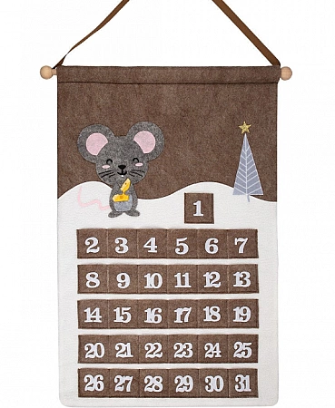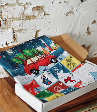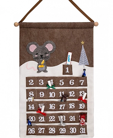Ce n'est pas tout à fait un calendrier de l'avent ordinaire, mais un jeu à part entière pour les enfants de 4 à 5 ans. Le kit comprend une grande affiche accrochée au mur, des cartes de tâches, des autocollants et une boîte en carton. L'essence du jeu est que la souris a suggéré à sa mère de décorer le sapin de Noël avec de vieux jouets, maintenant il doit se rendre chaque jour chez différents parents, à la recherche de décorations pour le sapin de Noël. Pendant le jeu, l'enfant collera l'image du héros dans la bonne pièce, décorera le sapin de Noël avec un autocollant approprié et apprendra en même temps la pleine conscience et le compte à rebours. Le jeu est conçu pour 14 jours avant le Nouvel An.