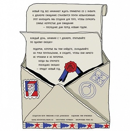 Ce calendrier de l'avent convient même aux plus petits, car il n'y a qu'une seule tâche ici et ce n'est pas difficile du tout.Chaque jour, vous devez ouvrir une fenêtre, en retirer un autocollant avec l'image d'un cadeau et le coller sur une carte postale séparée avec des facteurs. Au Nouvel An, les facteurs auront beaucoup de cadeaux. L'essentiel est de ne rien oublier ni de perdre, afin qu'ils puissent transporter leur cargaison jusqu'à la voiture du Père Noël en toute sécurité. Il n'y a rien de compliqué dans ce jeu, il convient donc aux enfants à partir de 4 ans, il leur apprendra l'exécution obligatoire des activités quotidiennes, la patience, afin de ne pas ouvrir une nouvelle cellule à l'avance. De plus, comme pour tout calendrier de l'avent, l'enfant pourra déterminer combien de temps il lui reste avant le Nouvel An.