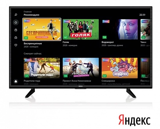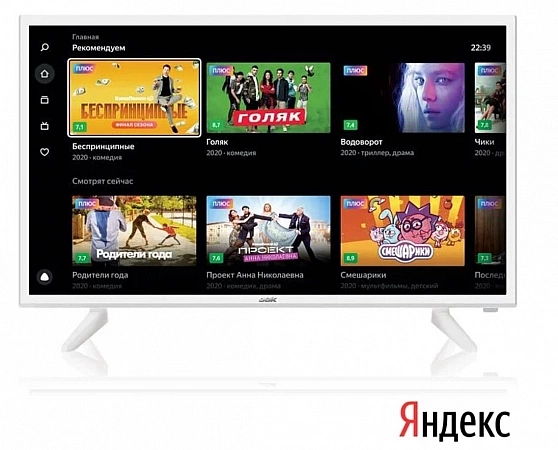 Modèle de téléviseur bon marché pour la maison et le jardin. Le fabricant a réduit la résolution de l'écran en HD et simplifié le système de haut-parleurs à deux haut-parleurs de huit watts pour s'adapter au budget. Si vous souhaitez acheter un téléviseur avec Alice jusqu'à 15 000 roubles, ce modèle sera optimal. C'est parce qu'il y a une diagonale assez grande - 39 pouces, une bonne qualité d'image - la reproduction des couleurs est proche du naturel, l'image ne mousse pas, mais est suffisamment claire, Smart TV fonctionne correctement, mais plus lentement que la plupart des concurrents. Cela est dû au fait que la quantité de RAM n'est que de 1 Go, alors que d'autres téléviseurs sont dotés de 1,5 Go de RAM ou plus. Et le modèle ne prend pas en charge les services Google.