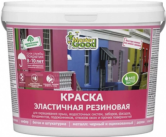 MasterGood convient à une variété de substrats et lisse toutes les bosses et rugosités. En raison de sa consistance épaisse, il a un excellent pouvoir couvrant et forme un revêtement parfaitement uniforme en une seule couche. La surface peinte n'a pas peur de l'exposition directe au soleil, ne se fissure pas lors du retrait naturel. Cependant, la matière colorante n'est pas conçue pour de fortes contraintes mécaniques ou une exposition prolongée à l'humidité, elle n'est donc pas utilisée pour peindre les sols et les piscines. De plus, la composition est plutôt capricieuse: pour obtenir un bon résultat, il est nécessaire de suivre strictement les instructions d'application.