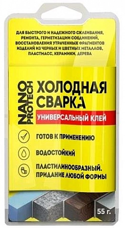 La polyvalence de la soudure à froid NANOPROTECH vous permet de combiner le métal, le bois, le plastique et la pierre en un seul ensemble. La consistance de la pâte à modeler (après pétrissage) prend une forme donnée et peut être utilisée dans la restauration de tous les éléments, y compris ceux travaillant sous charge. Le composé tolère parfaitement les changements de température, l'exposition à l'humidité et aux solvants. Après durcissement, il peut être traité (meulage, perçage, peinture, etc.). Les acheteurs sont satisfaits du prix, mais l'adhésif est mal représenté dans le commerce de détail, ce qui rend difficile l'achat rapide.