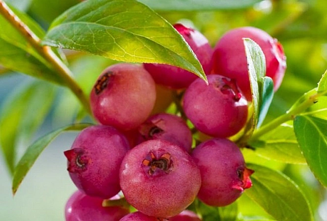 La variété Pink Blueberry est unique principalement en raison de la couleur rose du fruit, ce qui est inhabituel pour cette culture. L'arbuste se distingue par des taux élevés de résistance au gel, tolère des températures froides jusqu'à -30 et des coups de froid à court terme jusqu'à -34 degrés. Cette variété de myrtille pousse rapidement, formant des buissons solides et étalés qui peuvent être utilisés pour créer une haie. La plante est incroyablement voyante en automne, lorsque ses feuilles prennent différentes nuances de rouge et de jaune, et semble également intéressante en hiver en raison de ses tiges brun rougeâtre. La période de maturation est moyennement tardive, dans la voie du milieu, les baies mûrissent en septembre. La variété est autogame, mais avec la pollinisation croisée, le rendement et la taille des fruits seront plus élevés.