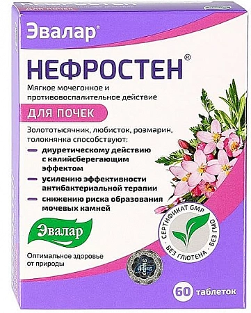 Le médicament Nefrosten de la société "Evalar" dans sa composition est à bien des égards similaire à Canephron, qui est également inclus dans le classement des meilleurs analogues de Cyston.Le médicament est prescrit pour la cystite, la pyélonéphrite, ainsi que pour la prévention et l'élimination des calculs urinaires, mais il est principalement utilisé dans le cadre d'un traitement complexe ou d'entretien. Il est recommandé de prendre les comprimés trois fois par jour, 2 pièces pendant 2 à 4 semaines. Ayant un effet combiné, Nefrosten n'aide pas immédiatement, mais avec un cours d'admission, il vous permet d'obtenir une amélioration significative de la condition. En plus des comprimés approuvés pour les adultes et les enfants de plus de 6 ans, le médicament est également disponible en gouttes pouvant être administrées aux enfants à partir d'un an.