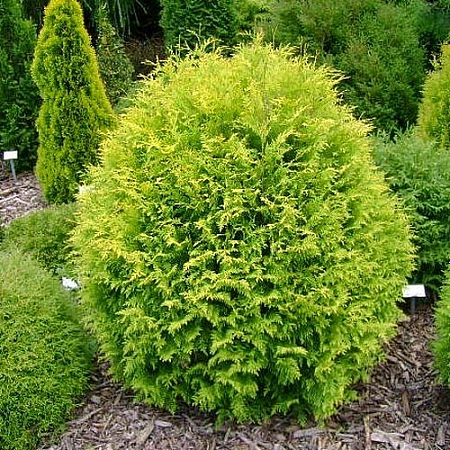 Thuya Golden Globe sous la forme d'une petite boule jaune dorée trouvera sa place dans n'importe quel jardin sans exception. A l'âge adulte, c'est un ballon idéal dont la teinte ne change pas tout au long de la saison.Les jardiniers préfèrent utiliser la plante pour les plantations simples, les collines rocheuses, la disposition des haies. La variété est populaire dans de nombreuses régions de notre pays, où vous pouvez créer des conditions optimales pour sa croissance. Pour les arborvitae, les sols limoneux fertiles avec une bonne humidité sont idéaux, elle aime le paillage autour du tronc avec de l'herbe tondue et ne tolère pas l'air sec. La plante n'a pas besoin d'une coupe de cheveux, mais elle vous permet de rendre la couronne encore plus épaisse.