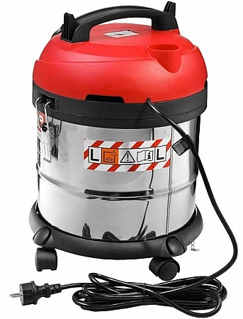 L'aspirateur de la société allemande Fubag est un ensemble de fonctions nécessaires, un montage soigné à petit prix. Cuve inox robuste, aspiration réglable, récupération des liquides, soufflage inversé, prise de courant. Lorsque vous travaillez simultanément avec des outils électriques, l'aspirateur s'éteint tardivement pour éliminer la poussière, la sciure ou les copeaux métalliques. Le délai d'extinction n'est pas disponible dans tous les modèles de bâtiments coûteux. La consommation électrique est de 1400 watts. Mais la puissance d'aspiration est modeste du fait du faible vide de 180 mbar.