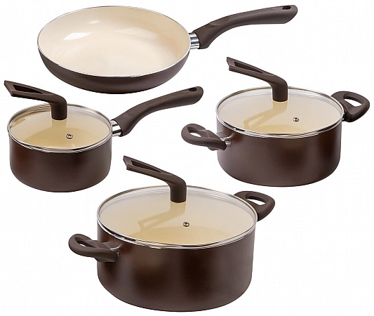 Cet ensemble de batterie de cuisine se compose d'une louche avec couvercle d'un volume de 1,6 l et ø 17,5 cm, d'une poêle ø 24 cm et de deux casseroles avec couvercles d'un volume de 2,9 et 5 litres avec un diamètre de fond de 20 et 24 cm respectivement . Une caractéristique de la batterie de cuisine d'un fabricant chinois est un revêtement en céramique résistant à la chaleur à l'intérieur et à l'extérieur de la batterie de cuisine légère en aluminium. Pendant la cuisson, les aliments ne brûlent pas même en l'absence d'huile et des couvercles hermétiques avec des trous de vapeur vous permettent de contrôler le processus de cuisson. De nombreux utilisateurs dans les critiques écrivent que la nourriture cuite dans ces casseroles s'avère particulièrement savoureuse, car les plats eux-mêmes ressemblent à des pots en argile. Parmi les avantages, les poignées qui restent froides sont en matériau bakélite moderne - un polymère anti-brûlure à base de résine naturelle. Certains utilisateurs sont mécontents que l'ensemble soit proposé en une seule couleur.