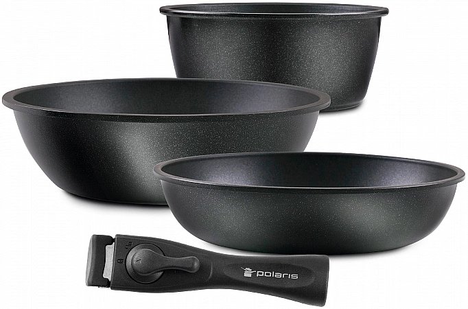 L'ensemble se compose d'une louche 18 cm d'un volume de 1,7 l, de deux poêles à frire d'une capacité de 2,5 litres chacune, ø 26 cm et d'une profonde ø 24 cm.Les trois récipients sont livrés avec une poignée anti-brûlure en bakélite amovible et facile à saisir qui a une finition antidérapante. Les récipients peuvent être utilisés pour les soupes, les rôtis, les légumes, la viande et le poisson. La batterie de cuisine est fabriquée par forgeage à partir d'aluminium à haute résistance, les surfaces intérieure et extérieure sont recouvertes de trois couches de composition antiadhésive DIAMANT 3X, qui contient une charge de grain de diamant. L'ensemble est conçu de manière à ce qu'il soit pratique de le ranger, après avoir composé tous les articles selon le principe des poupées gigognes. Les utilisateurs notent un revêtement durable qui ne craque pas, est bien nettoyé et lavé, et une poignée confortable. L'absence de couvercles est considérée comme un inconvénient, bien que beaucoup les achètent séparément, en tenant compte du diamètre du récipient.