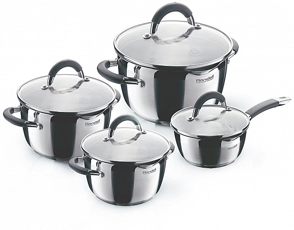 L'ensemble de plats de la marque allemande est fabriqué à l'aide de la technologie «triple fond» - un joint en aluminium est soudé entre deux disques en acier inoxydable. Un tel «gâteau en couches» assure un chauffage uniforme du fond et des parois du plat, empêche les aliments de brûler. Les aliments dans de tels plats cuisent plus rapidement, ce qui contribue à la préservation des nutriments et des vitamines. L'ensemble comprend : une casserole 1 l, fond ø 16,5 mm, et 3 casseroles d'un volume de 2,3 litres (ø 17,5 cm), 3,5 litres (ø 19,5 cm) et 5,7 litres (ø 21 cm) et des couvercles pour chaque élément. Dans les avis des utilisateurs, les avantages de l'ensemble sont notés - un bec pratique pour évacuer le liquide et la vapeur, une échelle de mesure à l'intérieur vous permet d'ajouter avec précision les ingrédients du plat, ainsi que des poignées résistantes à la chaleur sur les casseroles et couvercles. La vaisselle est lavable en machine. Les femmes au foyer aiment que les aliments dans de telles casseroles puissent être cuits avec un minimum d'huile. Les inconvénients comprennent des arêtes vives et des parois minces.