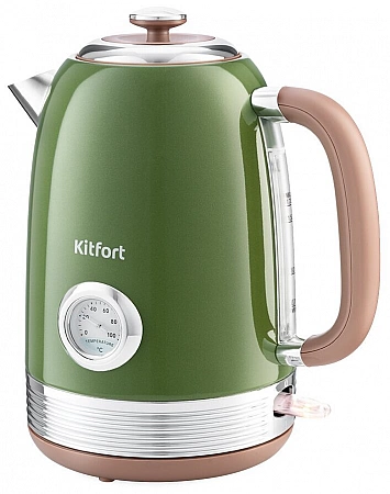 La marque d'électroménager russe présente une bouilloire électrique en inox au style rétro. Le boîtier de couleur Avocado avec inserts chromés est équipé d'une poignée en plastique confortable avec un effet antidérapant.Le corps a un thermomètre intégré qui indique la température de l'eau à l'intérieur du bol. C'est pratique lorsque vous buvez à nouveau du thé, vous pouvez voir à quel point l'eau est froide ou lors de la préparation de boissons spéciales - café, thé vert, infusions. Une bouilloire pleine bout en 7 minutes sans faire beaucoup de bruit. Le support chauffant en forme de disque est équipé d'une boîte pour stocker le cordon sous forme enroulée. Sous la poignée se trouve une zone transparente en plastique sur laquelle est appliquée l'échelle de déplacement. Les utilisateurs notent le poids léger de l'appareil, l'absence d'odeur, un filtre en nylon pratique.
