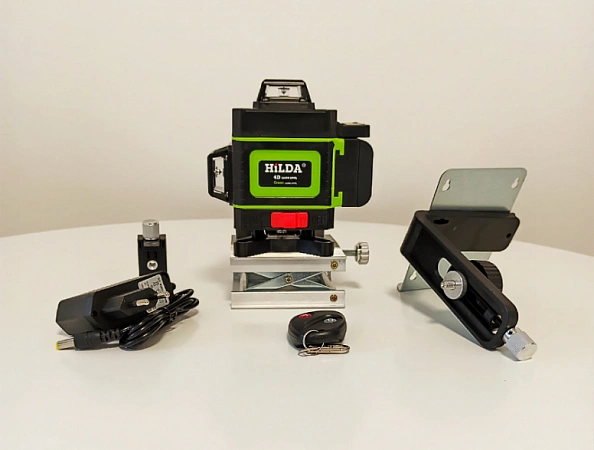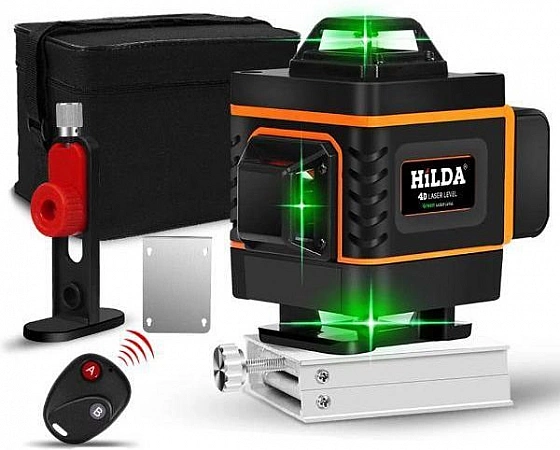 Un autre niveau professionnel avec 8 poutres verticales et 8 horizontales.L'appareil peut fonctionner jusqu'à 9 heures sans interruption et sans recharge. Il s'agit du niveau laser à faisceau vert 4D le moins cher. Dire que c'est le meilleur appareil pour son prix, c'est ne rien dire, car il existe de nombreux analogues de ce modèle. Et ceux qui sont de meilleure qualité sont beaucoup plus chers. Caché dans le boîtier Hilda se trouve un émetteur à cristaux bon marché. La portée du faisceau est fortement dépendante de l'éclairage, atteignant de 12 à 25 mètres. Le kit est livré avec une plate-forme élévatrice avec un élévateur coulissant. La hauteur maximale de la plate-forme est de 8,5 cm.