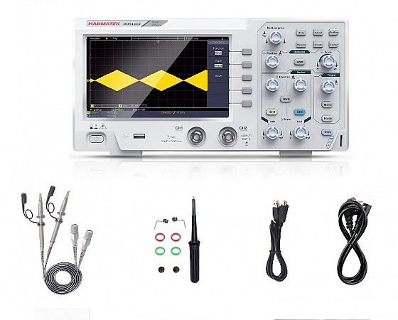 Există situații în care este necesar să se facă diagnostice complexe cu mai multe fațete, dar cu o vizită la fața locului. Un osciloscop de buzunar obișnuit nu va funcționa aici și este dificil și incomod să trageți cu dvs. un instrument voluminos. Osciloscopul DSO5102P într-o astfel de situație va fi pur și simplu indispensabil. În primul rând, dispozitivul este mai subțire decât omologii săi și există un mâner confortabil pe carcasă. Producătorul nu a reușit să reducă semnificativ carcasa, deoarece în acest caz funcționalitatea ar trebui sacrificată și avem în fața noastră un osciloscop profesionist, nu un amator. Există o funcție pentru înregistrarea unui semnal și afișarea ulterioară a acestuia. Ei bine, desigur, opțiunea de conectare USB, care a devenit deja familiară pe dispozitivele de acest gen.