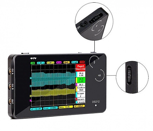 Lieve DS212 are o funcționalitate avansată cu o lățime de bandă mică. Are un afișaj mare și are încorporat un generator de semnal. Există suficientă memorie, controlul este convenabil datorită celor 2 encodere și auto-tuning. În ciuda carcasei metalice, osciloscopul s-a dovedit a fi ușor și compact. Este bine asamblat, pachetul este complet, există chiar și o cheie hexagonală și instrucțiuni în limba engleză în cutie. Pentru lucru cu drepturi depline, este necesar să comandați o sondă suplimentară pentru X10 (doar X1 este inclus în kit). Principalul motiv pentru recenziile negative despre produs a fost bateria - capacitatea sa este de doar 500 mAh. Din acest motiv, va trebui să ții tot timpul un încărcător la îndemână.