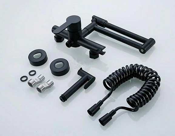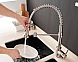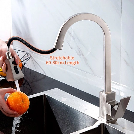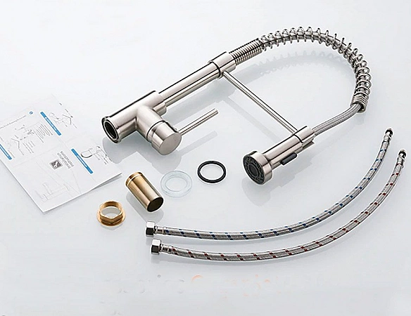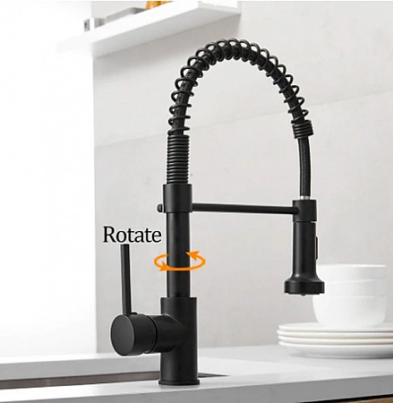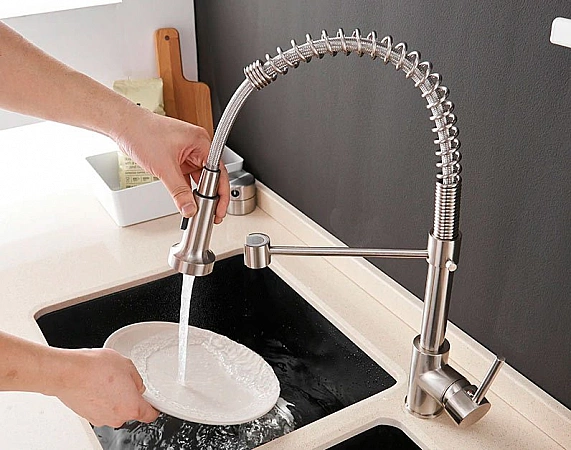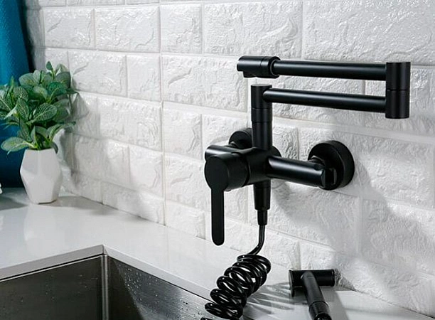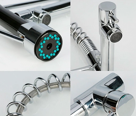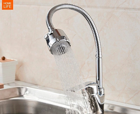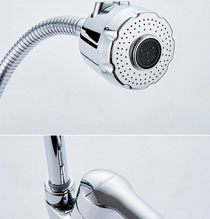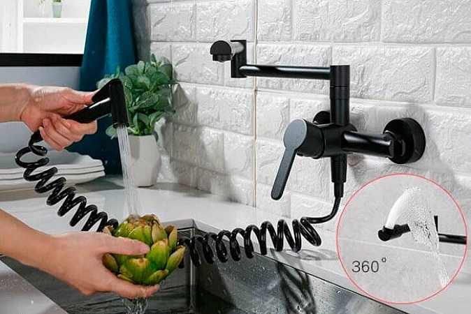 Acest robinet împrumută câteva detalii de la robinete profesionale și umplere pentru oale. Cumpărătorii site-ului Aliexpress, care au reușit să testeze noutatea, cred că o astfel de simbioză s-a dovedit a fi de succes. Modelul se pliază astfel încât practic să nu ocupe spațiu deasupra chiuvetei. Toate elementele structurale se rotesc la 360 de grade. În ceea ce privește confortul atunci când puneți vase în chiuvetă, acesta este cel mai bun tip de instalații sanitare pentru bucătărie.Și dacă acest lucru nu este suficient pentru unele sarcini, puteți folosi capul de duș, care are un furtun separat și o pârghie pentru reglare. Inserția este doar montată pe perete, așa că înainte de a cumpăra, trebuie să vă asigurați că această opțiune de instalare vi se potrivește.