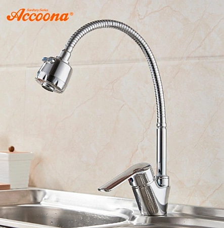 Modelul de bază cu o singură pârghie va fi de interes pentru proprietarii de bucătării compacte. Înălțimea gurii vă permite să instalați robinetul pe orice chiuvetă. În ciuda prețului scăzut, produsul este de înaltă calitate și confortabil. Căsătoria practic nu se întâlnește - vânzătorul site-ului Aliexpress verifică toate mixerele înainte de a trimite. Modelul este simplu dar are multe detalii interesante. De exemplu - o gura flexibilă care își poate păstra forma. Ei bine, un bonus neașteptat pentru un angajat de stat este funcționarea aeratorului în două moduri, care sunt comutate de un singur buton. Nici ambalajul mărfurilor nu este rău: cutia, totuși, este din carton subțire, dar este acolo! Doar că vânzătorul a fost lipsit de comunicare și există, de asemenea, întârzieri în trimitere.