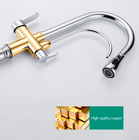 Modelul nu este nou pe Aliexpress, dar nu și-a pierdut relevanța. Mixerul este prezentat în 4 tonuri. Are un cap de duș retractabil cu un furtun robust din cauciuc. Este convenabil de utilizat, mai ales dacă bucătăria are o chiuvetă dublă. Aeratorul este înlocuibil și poate fi curățat. Furtunul nu vibrează la presiunea mare a apei. Apa filtrată este furnizată printr-un robinet separat, butonul de pornire funcționează clar. Cartușul costă spaniol, firmele Sedal. Se distinge prin cea mai bună resursă și loialitate față de apa dura. Produs bun, dar nu ieftin. Prin urmare, în curând mai multe mărci de buget vor forța acest model să iasă de pe piață.