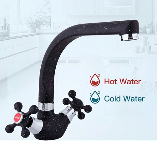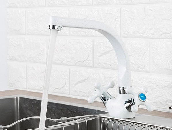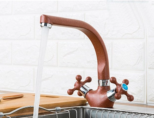 Gazdelor le place acest model la un preț accesibil și o selecție bună de culori. Pe lângă clasicul alb-negru, vânzătorul de pe Aliexpress are robinete în trei nuanțe de maro.Iar instalatorii iubesc pentru o mai bună întreținere - au înlocuit garnitura și robinetul funcționează din nou. Acest robinet este din ceramică, baza este puternică, amintește tactil de marmură. Textura este netedă, iar butoanele se rotesc lin. Cu toate acestea, consumul său de apă este mai mare decât cel al modelelor cu pârghie, deoarece până când utilizatorul găsește temperatura și presiunea optime, apa curge pur și simplu în gol. Și încă trebuie să folosiți două mâini, iar în bucătărie nu este întotdeauna convenabil.