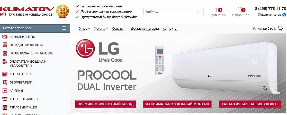 Klimatov este un dealer oficial cu peste 50 de mărci. Echipamentele climatice sunt furnizate direct de la producători, fără o marjă mare. Specialiștii instalează dispozitive în conformitate cu clasificarea ISO, oferă o garanție de cinci ani, sub rezerva întreținerii regulate. Recenziile scriu despre livrarea și instalarea promptă a echipamentelor. Compania deține adesea promoții, oferă bonusuri clienților obișnuiți. Managerii înțeleg sortimentul, cumpărători prompti. Angajații sunt numiți responsabili și politicoși. Instalarea durează mai puțin de 2 ore, apoi resturile sunt îndepărtate. Numai livrarea eșuează - se plătește, în sezon timpul de așteptare se întinde la două săptămâni.
