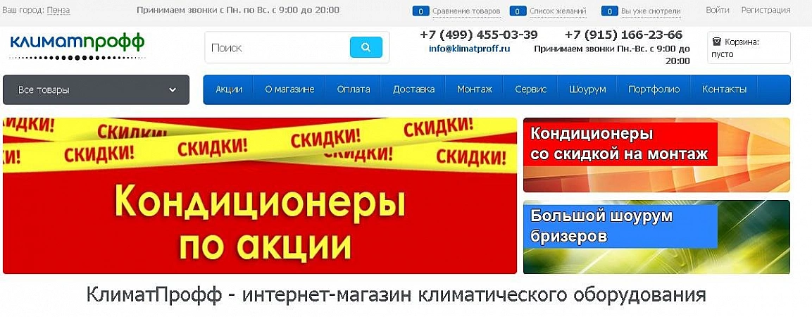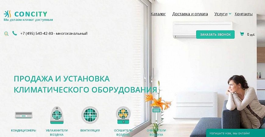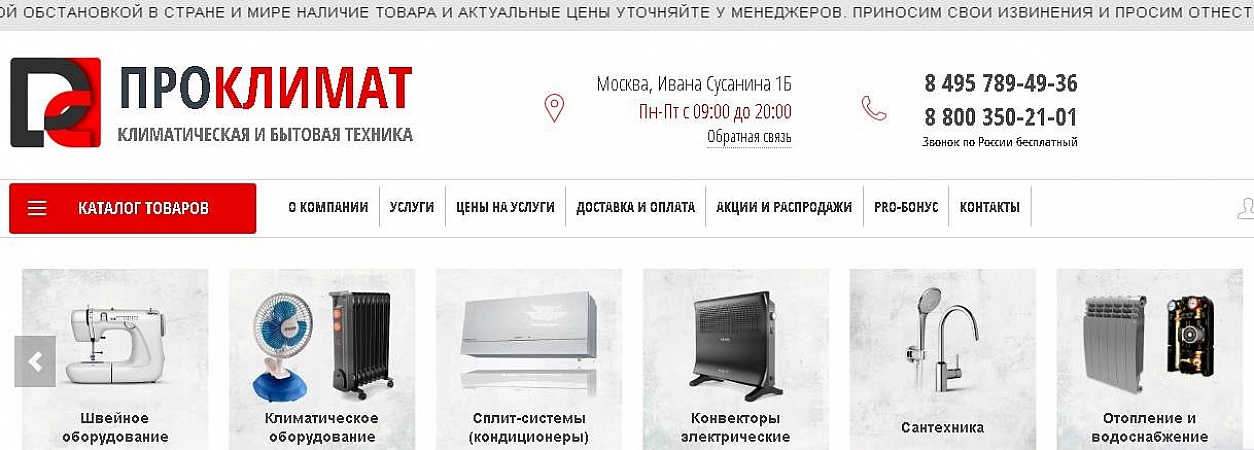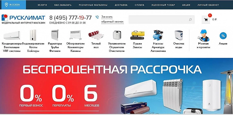 Rusklimat desfășoară lucrări de orice complexitate, vinde, instalează și întreține aparate de aer condiționat casnice și industriale. La consultarea inițială, angajații oferă informații despre cost, nu se abat de la plan.Managerul insoteste clientul, incepand de la fluxul de documente, incheind cu verificarea serviciilor prestate. Angajații vin la șantier cu cataloage de echipamente. Există un serviciu de comunicare la distanță cu administratorul, cumpărătorul arată incinta prin Skype. Recenziile scriu că costul final este indicat în contract, fără surprize. Garanția include lucrări de reparații, demontarea unităților ieșite, livrarea și montarea. Compania oferă un an suplimentar de serviciu gratuit pentru toate tipurile de echipamente. Cu toate acestea, intervalul prezentat pe site nu este adevărat. Multe articole sunt epuizate.
