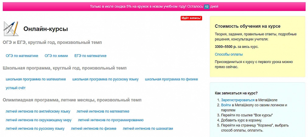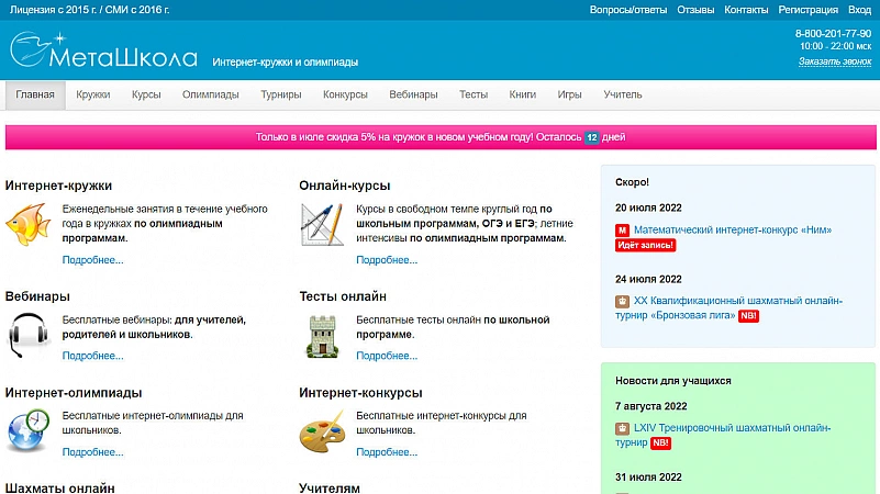 Platformă de internet cu prețuri accesibile, o mulțime de teste și olimpiade gratuite. Scopul principal al serviciului este de a consolida cunoștințele de bază ale elevilor din clasele 1-11.Aici vă puteți pregăti, de asemenea, pentru examenul de stat unificat și OGE folosind webinarii online. Site-ul în sine, însă, este puțin antediluvian, dar totul este scris clar pe paginile sale. Există puține recenzii despre serviciu, deși acesta există de mult timp. În general, merită atenție: este o platformă excelentă pentru a face matematică. Da, unele sarcini de la olimpiade sunt destul de simple, dar MetaSchool poate fi folosit ca instrument pentru educație suplimentară.