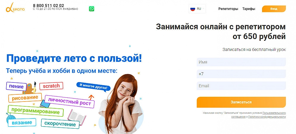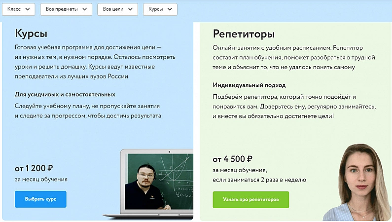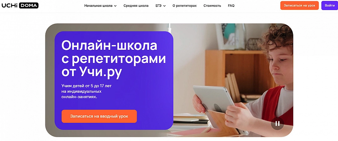 Platforma subsidiara Uchi.ru. Specializarea acestei școli online este engleză, programare, rusă, alfabetizare computer și matematică din clasele 1 până la 11. Tutorii se ocupă personal de copii, cursurile sunt achiziționate la pachet. Există, de asemenea, 1 lecție introductivă gratuită, care durează 30 de minute. În procesul de cunoaștere a elevului, tutorele află nivelul de cunoștințe și întocmește un program personal de pregătire. Particularitatea platformei este că, dacă dintr-un anumit motiv părintelui nu îi plac rezultatele cursurilor, atunci banii pot fi returnați cu ușurință pentru lecțiile neterminate. Adevărat, unii utilizatori se confruntă cu o întârziere în perioada de returnare, dar acest lucru este rar: banii ajung la părinți în termen de 7 zile lucrătoare.Platforma este interesantă cu o abordare non-trivială a învățării, dar lecțiile nu sunt adaptate în timp unor regiuni ale Rusiei.
