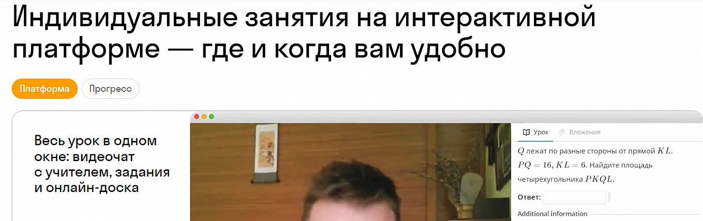 Scoala online cu tarife accesibile. Cursurile se țin online, individual, cu fiecare student. Pentru muncă, profesorii folosesc platforma site-ului și Skype. Practic nu există nemulțumiri în rândul elevilor și al părinților lor: nivelul tutorilor, metodele de prezentare a materialului și costurile se potrivesc celor mai mulți utilizatori. Este posibil să se îmbunătățească cunoștințele în matematică aici atât pentru elevii de școală elementară, cât și pentru absolvenți înaintea OGE și a examenului de stat unificat. Înainte de începerea pregătirii, are loc o lecție de probă, cu ajutorul căreia metodologii și tutorele determină nivelul actual al studentului. Și deja pe baza datelor își fac un plan personal. Adevărat, nu va funcționa să plătiți pentru 1 lecție pe această platformă - cursurile sunt achiziționate în pachete. Dar atunci când cumpără un pachet, utilizatorul are acces la webinarii gratuite și 2 cursuri gratuite. În plus, serviciul are o secțiune „Răspuns”, care ajută la rezolvarea temelor complexe.
