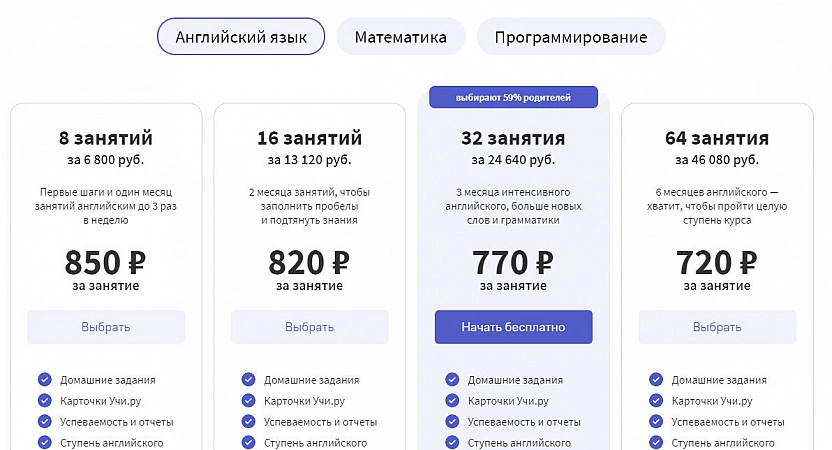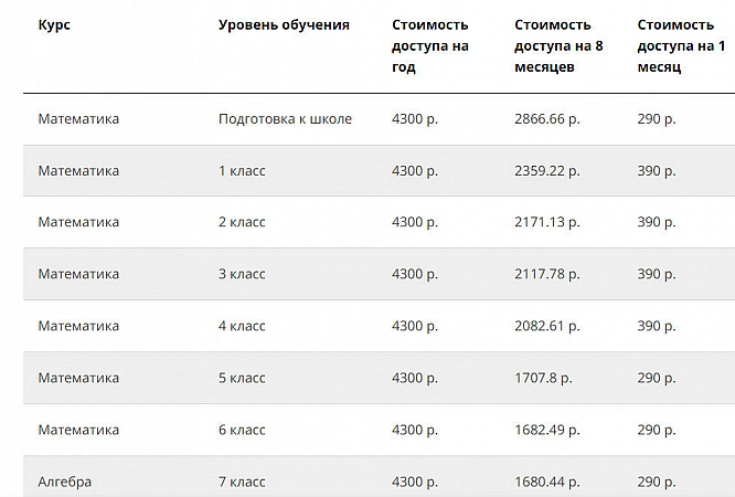 Platforma de învățământ la distanță oferă elevilor din clasele 1 până la 11 să-și consolideze cunoștințele de matematică/algebră, iar preșcolarilor să se pregătească pentru stăpânirea curriculum-ului școlar.Aici se desfășoară teste și olimpiade online, există cursuri interactive și sarcini gratuite. Acestea din urmă sunt disponibile pentru școlari în zilele lucrătoare până la ora 16:00, dar accesul trebuie deschis de către profesor prin contul său personal. Prețurile platformei sunt medii, dar la cumpărarea unui abonament anual, puteți economisi puțin. Deși serviciul are destul de multe recenzii pozitive, există încă oameni nemulțumiți de programul Uchi.ru. Practic, părinții nu sunt mulțumiți de lipsa lecțiilor personale și de impunerea achiziției de rambursat. Evaluarea scăzută a platformei se datorează și faptului că nu toți copiii sunt potriviți pentru un format de învățare interactiv. În ciuda deficiențelor existente, serviciul are un plus foarte atractiv - prețuri adecvate. Costul mediu al cursurilor de aici variază între 290-790 de ruble pe lună.