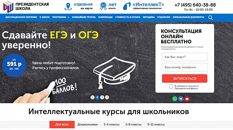 Școală cu un număr mare de programe educaționale. Există învățământ la distanță și dezvoltarea de cursuri de matematică online, precum și pregătire pentru OGE, examenul de stat unificat. În plus, Școala Prezidențială are filiale în Moscova și în alte orașe ale Federației Ruse. Platforma online oferă programe pentru educația individuală/de grup a studenților juniori și seniori. Etapa inițială are ca scop dezvoltarea unei mentalități matematice, iar cursurile de dezvoltare au ca scop un studiu detaliat al „reginei științelor”. Mai mult, cu o imersiune completă în fiecare subiect din programa școlară și o explicație clară pentru elevii de toate vârstele. O altă caracteristică a școlii online este o metodologie de predare unică. Aici nu doar predau, ci ajută și la creșterea stimei de sine, la eliminarea fricii de profesor și la răspunsul la tablă. Școala este destul de puternică, dar costul educației în ea este destul de mare. Dar aici este pe deplin justificat de calitatea și metodele de predare.
