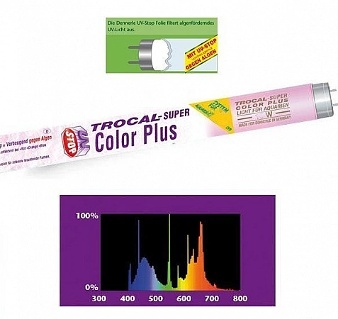 Lampă fluorescentă de la unul dintre cei mai cunoscuți producători. Principalul avantaj - în acvariile de apă dulce, culoarea plantelor și a peștilor este îmbunătățită, culoarea este accentuată. Tonurile de albastru și roșu-portocaliu arată deosebit de strălucitoare. Poate fi combinat cu lampa Trocal T5 Amazon-Day. Funcționează cu o pierdere neglijabilă a spectrului de lumină timp de peste 10.000 de ore. Producătorul oferă o peliculă de protecție UV-stop care previne creșterea algelor. Dar, în realitate, nu dă niciun efect - algele continuă să crească. Dar această soluție are și o latură pozitivă - filmul protejează lampa de deteriorarea mecanică, nu se va prăbuși în mâini în caz de impact.