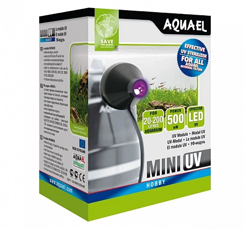 Sterilizatorul de marcă binecunoscută este realizat sub formă de mânecă scurtă, care este suprapusă pe duza de ieșire a filtrului. Lumina UV este emisă de patru LED-uri. Lampa se potrivește tuturor filtrelor interne ale aceleiași mărci. Utilizarea periodică a lămpii Aquael previne bolile la peștii de acvariu prin distrugerea bacteriilor patogene. Utilizatorilor le place ușurința instalării, fără nevoie de îngrijire specială. Lampa este foarte compactă, instalarea sa nu afectează aspectul acvariului, nu încalcă compoziția generală.