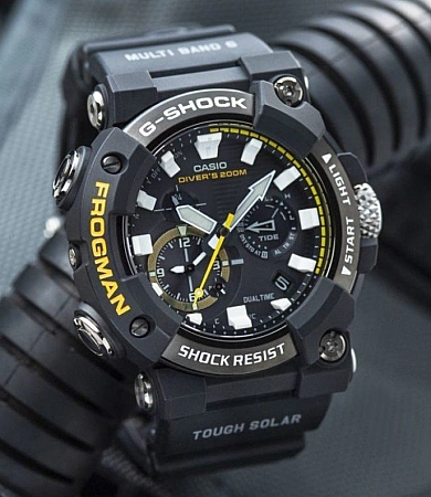 Frogman GWF-A1000 este un ceas pentru sporturile subacvatice profesionale, deși mulți consumatori sunt interesați de aspectul lor în viața de zi cu zi. Valoarea lor practică constă într-un mod special de scufundare, în care orele și minutele sunt combinate și se mișcă sincron în timpul unei scufundări, precum și caracteristici speciale, cum ar fi o diagramă a mareelor, un jurnal de scufundare și rezistența la apă ISO200, care vă permite să folosește ceasul sub apă. Etanșeitatea este asigurată de un corp multicomponent dintr-o construcție turnată dintr-o singură piesă din fibră de carbon ușoară și durabilă. Cu toate acestea, dezvoltatorii din anumite motive au eliminat funcții atât de importante pentru submariner, cum ar fi un barometru, termometru, busolă și indicator de adâncime.