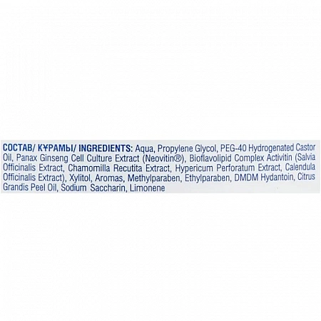 - Ingrediente active: complex bioantioxidant de ginseng Neovitin, complex bioflavolipid Activitin cu galbenele, mușețel, sunătoare, salvie și xilitol
