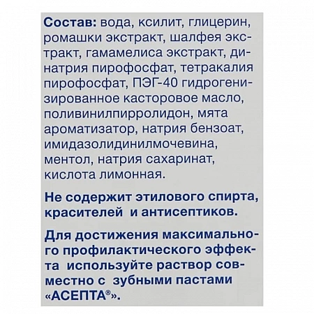 Una dintre cele mai bune soluții cu ierburi naturale. Asepta este conceput pentru îngrijirea cuprinzătoare nu numai pentru dinți, ci și pentru gingii.Datorită conținutului ridicat de salvie, hamamelis și mușețel, balsamul reduce sângerarea și inflamația, protejează ușor împotriva bacteriilor și reduce umflarea. Potrivit recenziilor, acest fluid de irigație ajută chiar și la strângerea buzunarelor gingiilor. Menta și mentolul energizează, au un gust bun și împrospătează respirația. Potrivit pentru fumat și purtarea structurilor dentare. Dar trebuie să te obișnuiești cu aplicația. Nu este foarte convenabil să-l turnați fără dozator. În acest caz, produsul este diluat de la 1 la 10, iar volumul său este de numai 250 de mililitri. Prin urmare, fiecare picătură își merită greutatea în aur.