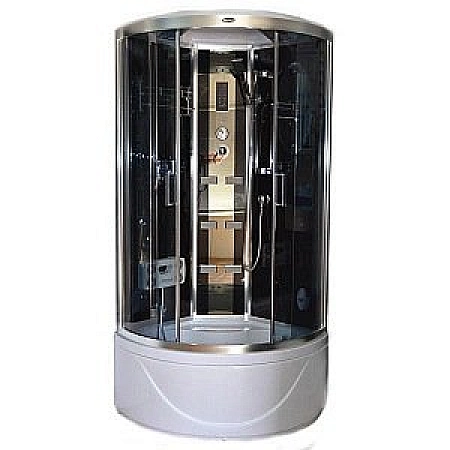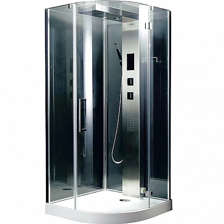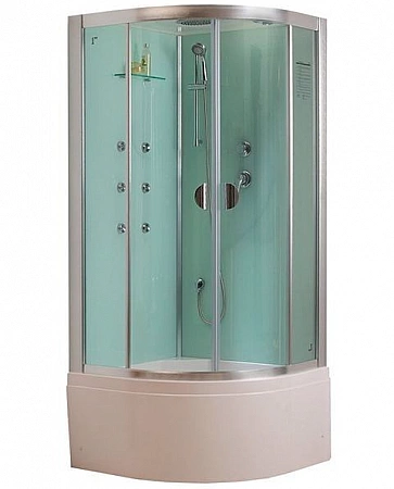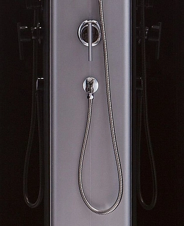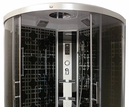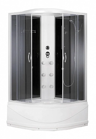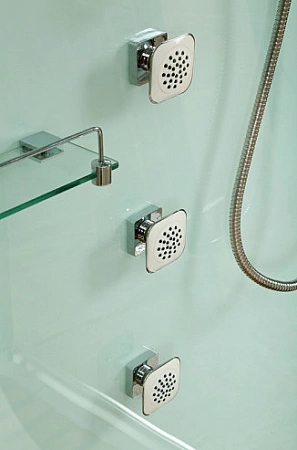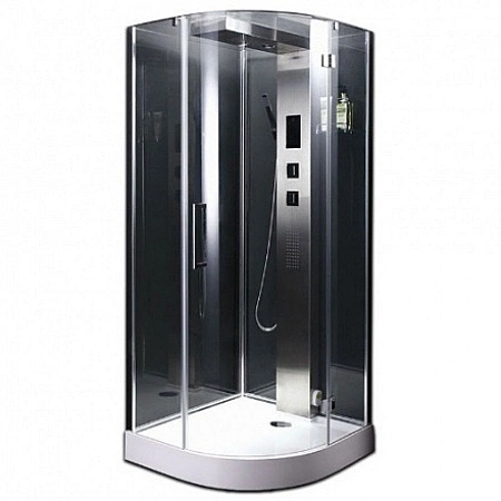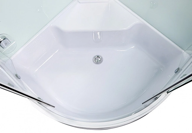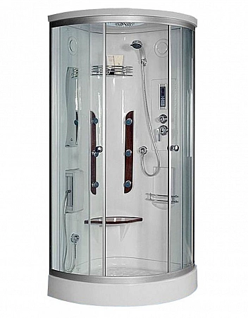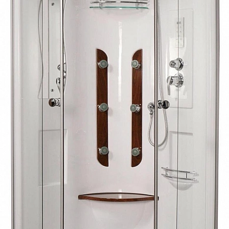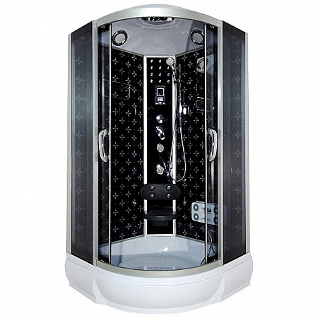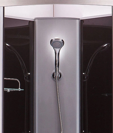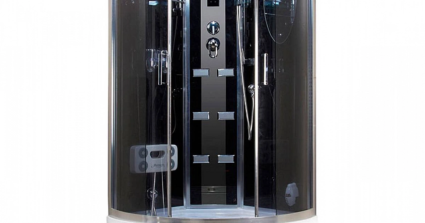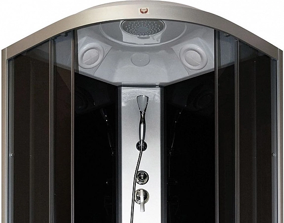 Duș de colț foarte stilat, realizat în culori închise. Marele său plus este hidromasajul pentru 12 jeturi în trei planuri: pentru picioare, cap și spate. Modelul este echipat cu un scaun rabatabil, o oglinda, rafturi si un cap de dus. Dacă dorești, poți să pornești radioul și să te conectezi la telefon prin bluetooth, dar microfonul este adesea defect, iar difuzorul produce un sunet mediocru. Dezavantajele modelului nu se opresc aici. Va fi necesar să conectați pereții și paletul cu ajutorul unui etanșant, deoarece se obțin goluri fără acesta. Plasticul acoperișului este subțire, motiv pentru care este problematică fixarea stabilă a prizei de iluminare de fundal.Panoul tactil este prost impermeabilizat, sub influența temperaturilor și a apei, se poate dezlipi.