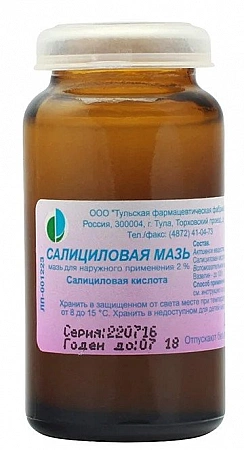 Unguentul cu acid salicilic este cel mai „vechi” remediu folosit în lupta pentru pielea curată în psoriazis, atât separat, cât și împreună cu glucocorticosteroizi. Se aplica de 2-3 ori pe zi pe pielea afectata, se foloseste pana la imbunatatirea completa. În plus, poate fi folosit pentru cursuri lungi: fără dependență și fără efecte secundare grave. Dar reacțiile alergice pot apărea în continuare cu sensibilitate ridicată la acidul salicilic. Medicamentul non-hormonal exfoliază fulgii pielii, face față conținutului crescut de grăsime și reduce secreția glandelor sudoripare. Adevărat, în timpul unei perioade de erupții cutanate severe, acest remediu este inutil fără GCS și dietă. Se recomandă utilizarea unguentului salicilic în tratamentul complex al psoriazisului.