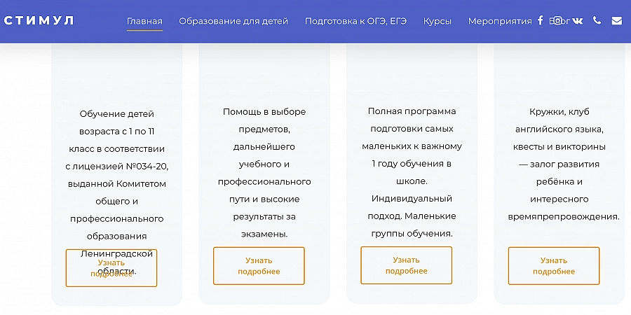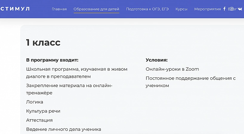 Educația de stimulare poate înlocui complet frecvența obișnuită la școală. Oferă o educație prin corespondență cu drepturi depline pentru copiii din clasele primare, secundare și superioare. La sfârșitul școlii se susțin examene de stat și se obține un certificat. Potrivit părinților, școala are profesori foarte competenți și un format de învățare convenabil. Cursurile se desfășoară în grupuri mici de 10 copii. În același timp, se deschide un caz separat pentru fiecare copil, în conformitate cu care tutorele ajustează calea individuală de învățare. Pe lângă cursurile de lungă durată, școala poate comanda și pregătirea pentru olimpiade de matematică, logică și șah. Din păcate, nu există cursuri suplimentare în rusă sau engleză.