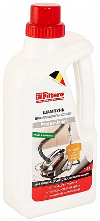 Filtero este un produs universal pentru spalarea aspiratoarelor, inclusiv a aparatelor profesionale de la Bosch, Karcher, Thomas, Selmer si Wax. Compoziția conține o proporție mică de substanțe antibacteriene, ceea ce face curățarea și mai eficientă. Prin el însuși, concentratul îndepărtează perfect petele nu prea vechi, îndepărtează praful și, de asemenea, reduce rata de contaminare a acoperirilor pufoase. În recenzii, utilizatorii indică faptul că produsul are un consum destul de mare, suficient pentru 20-25 de curățări. Cu toate acestea, prețul său este cu 30-50% mai mic decât multe alte concentrate, ceea ce poate justifica o formulă nu prea economică. Fosfații nu sunt indicați în compoziție, dar nu există note despre hipoalergenicitate, așa că dacă aveți alergii, este mai bine să alegeți un alt produs.