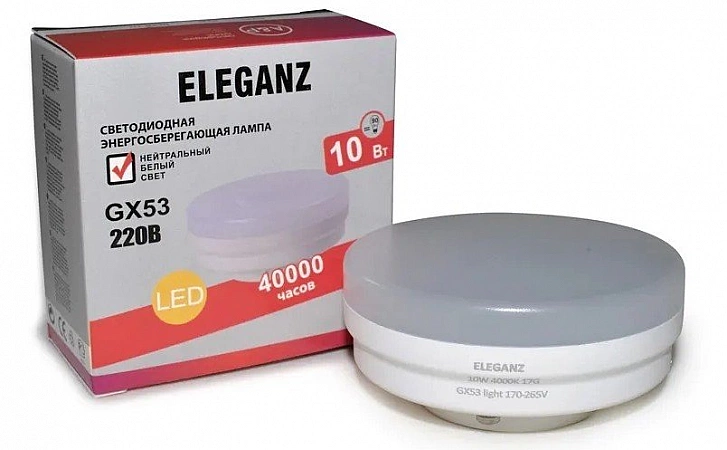 Becurile LED GX53 standard de la Eleganz sunt vândute în seturi de 5 bucăți fiecare. LED-urile emit o culoare albă neutră la o temperatură de 4500K. Datorită acestui lucru, nu vă obosesc vederea, elimină oboseala excesivă a ochilor, chiar dacă stați mult timp într-o cameră cu astfel de iluminare. Puterea redusă de 10 W vă permite să economisiți până la 90% din energia electrică în comparație cu utilizarea lămpilor cu incandescență clasice. Compoziția lămpilor nu conține nici mercur, nici metale grele care pot avea un efect toxic asupra oamenilor și naturii.Producătorul susține că durata de viață a produselor ajunge la 40.000 de ore, dar acest lucru ar trebui tratat cu scepticism - adesea becurile „nu trăiesc” nici până la mijlocul acestei perioade. Pe de altă parte, garanția este mai lungă decât mulți concurenți și este de până la 2 ani.