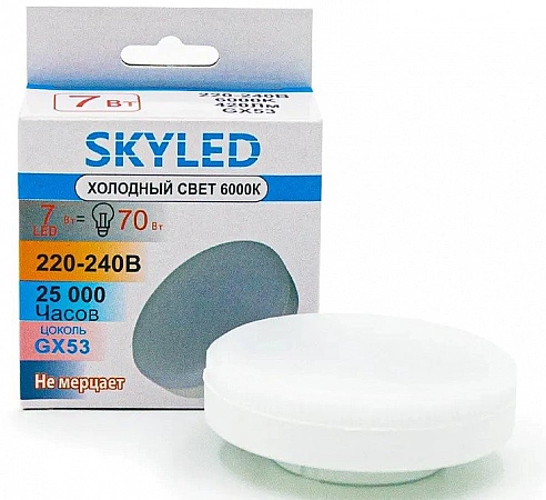 Lampa LED SKYLED GX53C7P cu lumină rece emite o strălucire cu o temperatură de culoare de 6000K. Aceasta este o lumină suficient de strălucitoare și albă, care, în timpul observării prelungite, poate provoca disconfort observatorului. Pe de altă parte, modelul are protecție împotriva pâlpâirii, astfel încât efectul negativ asupra vederii este minimizat. Luminozitatea este de 420 lm la o putere de 7 W, totuși, aceasta este suficientă pentru majoritatea sarcinilor precum iluminarea unei case de țară sau organizarea iluminatului decorativ. Becul este echivalentul unui bec tradițional cu incandescență de 70 W, dar în același timp diferă prin consumul de energie mult mai mic - economii de până la 90%. Produsul este realizat din materiale sigure, nuanta este din plastic mat care imprastia lumina. Becul practic nu se încălzește, datorită căruia durata de viață ajunge la 30.000 de ore.