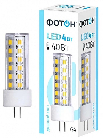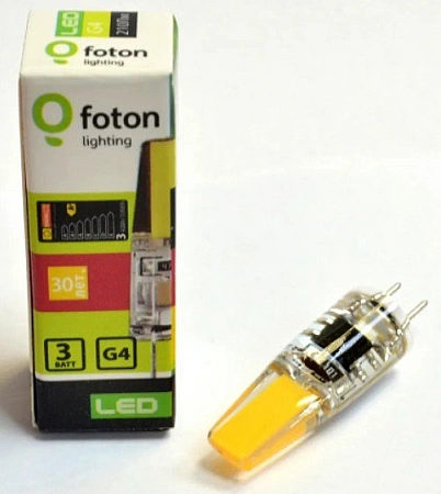 Lămpile de la marca Foton sunt potrivite ca înlocuitor pentru becurile cu halogen și tradiționale cu bază G4. Produsele sunt construite pe baza de LED-uri SMD care emit lumină albă neutră cu o temperatură de culoare de 4000K. Factorul de pulsație este mai mic de 1%, ceea ce înseamnă că nu există nicio pâlpâire dăunătoare pentru ochi. Datorita incalzirii reduse in timpul functionarii, aceste becuri sunt compatibile cu lămpile echipate cu abajururi din material textil si hartie.Luminozitatea este destul de mare - 410 lm, ceea ce permite utilizarea elementelor LED în candelabrele principale de iluminat. Cu doar 4 wați de putere, produsul consumă de 10 ori mai puțină energie electrică decât un bec tradițional cu incandescență de aceeași luminozitate. De remarcat și o resursă mare, ajungând la 30.000 de ore de funcționare continuă. Dintre minusuri - un preț destul de mare pentru un bec.