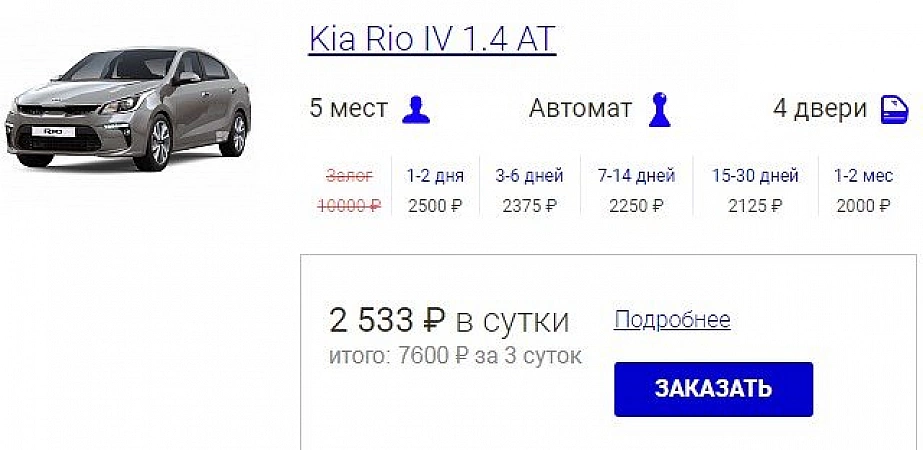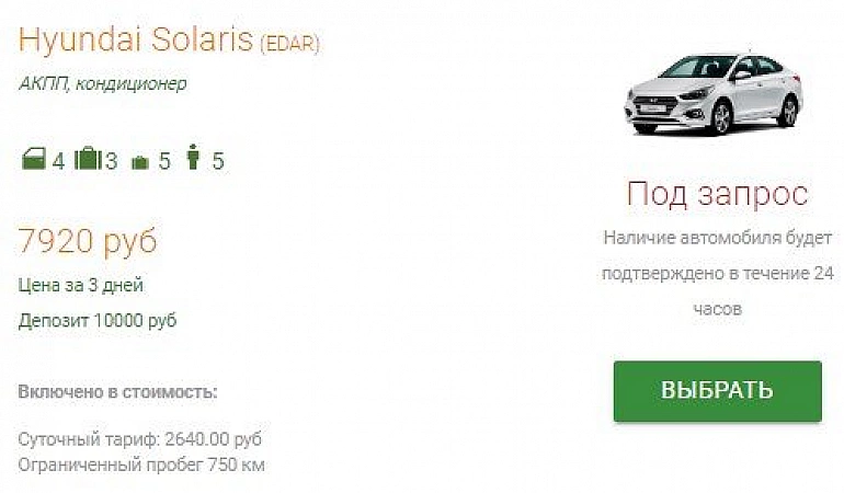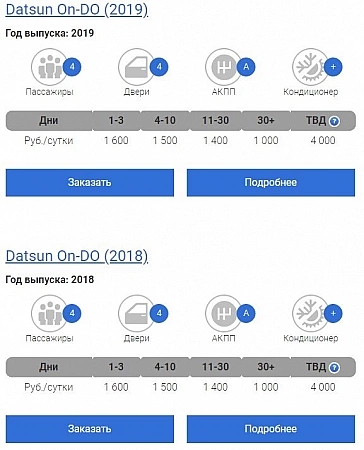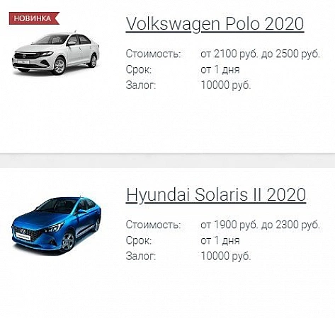 Företaget erbjuder bilar till rimliga priser (från 2000 rubel per dag) och kräver ingen deposition. Verksamhetens territorium är inte begränsat. Detta är de bästa hyresvillkoren bland konkurrenterna.